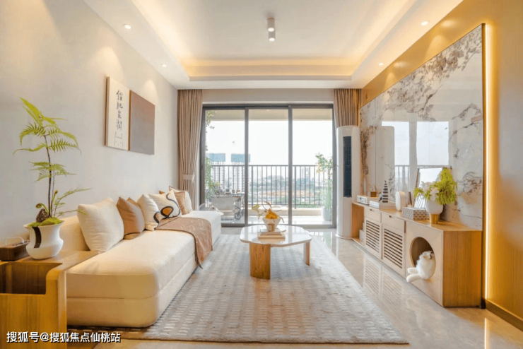 一体化竖厅设计,客厅连通阳台,在兼顾舒适度的同时,还可延展出一整排收纳墙,实用性相当出色。