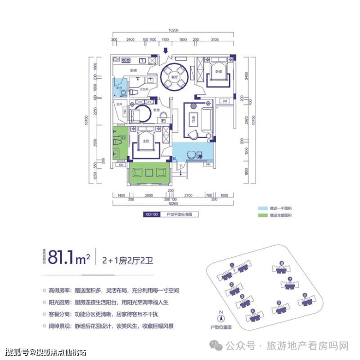 户型2:建筑面积约81.1㎡,2+1房2厅2卫。该户型布局紧凑,功能齐全;高得房率,可灵活布局,书房创意空间;厨房带明窗,并连接生活小阳台;客厅连接后花园,美景尽收眼底。