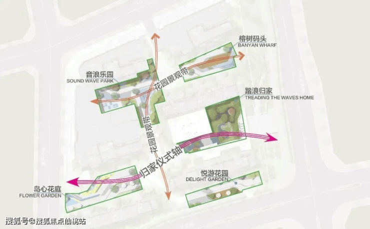 萃取厦门鼓浪屿自然风光,以林、岛、浪、石作为景观元素,打造鼓浪屿风情主题景观轴营造归家主动线,构建踏浪归家、榕树码头、音浪乐园、岛心花庭、悦游花园等全龄段社区休闲配套。