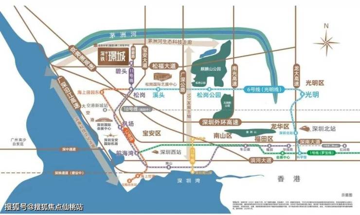 在交通方面,地铁上盖+立体路网,使通勤效率拉满。该项目衔接地铁11号线碧头站(始发站),乘地铁可快速直达前海、福田CBD及深圳湾,还可换乘6号线、12号线,通达光明科学城、宝安中心区。而陆路紧邻松福大道、外环高速,西接京港澳高速,东连宝安大道,畅达珠三角核心城市。同时,近邻宝安国际机场、福永客运码头,形成“空陆海”立体交通网络。