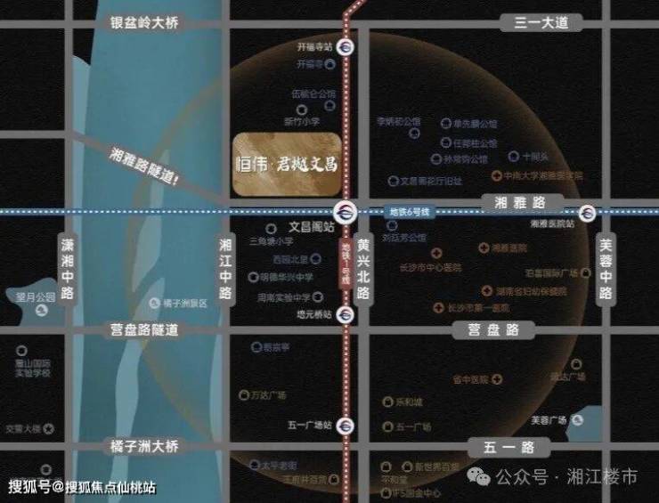 城发恒伟·君樾文昌坐落于长沙主城核芯,占据黄兴路与湘江畔的黄金地段,还毗邻双地铁文昌阁站,仅约100米的距离,实现五维立体交通畅达全球 。其所处的文昌阁板块,是千年湖湘的文化源点,文昌阁旧址、古开福寺等文化瑰宝环绕,深厚的历史底蕴赋予了这片土地独一无二的文化气息。