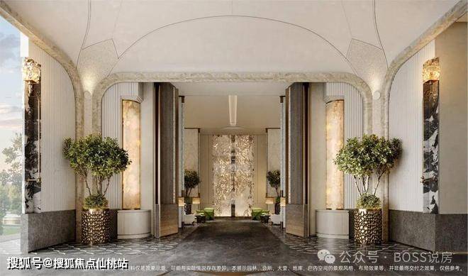 入口与礼序:主入口 “一城风华门”,贝米黄金石材、非遗珐琅门把手、八芒太阳纹细节,仪式感强。