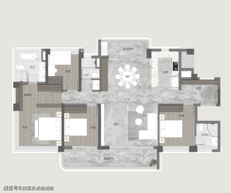 此外,该户型富有灵活性,公共区域可与相邻空间依需打通,卧室亦可灵活调整为双套房或整合为大套间。尤其是为多孩家庭设计的“灵动双子套房”,既守护彼此的私密天地,又让父母的照看近在咫尺,让亲密与独立温情共存。