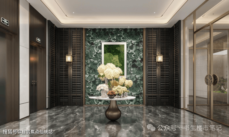 小区内部使用大量普拉达绿岩板饰面,其有着碧浪破碎般的优雅肌理,带着浓厚的宝格丽风情。这样浪漫大胆的用料,公区几乎随处可见。