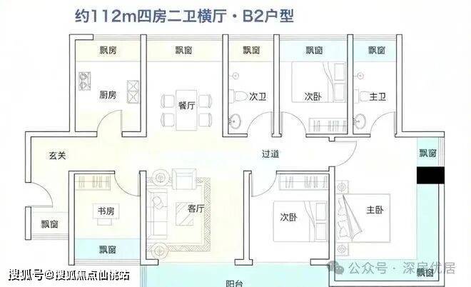 112㎡的4房2厅2卫(B1户型),设计的是横厅南北通透格局,进门入户玄关,餐客厅一体化设计,五开间朝南,全屋十面飘窗,主卧270°无柱转角飘窗,U型厨房,卫生间干湿分离,得房率约100%(包含赠送),客厅连接餐厅出大阳台西南朝向。