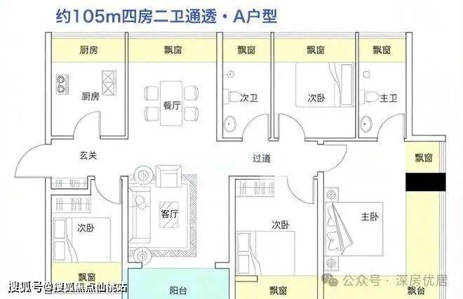 105㎡的4房2厅2卫,设计的是竖厅南北通透格局,餐客厅分离设计,四开间朝南,全屋十面飘窗,主卧270°无柱转角飘窗,U型厨房,卫生间干湿分离,得房率约100%(包含赠送),阳台东南朝向。