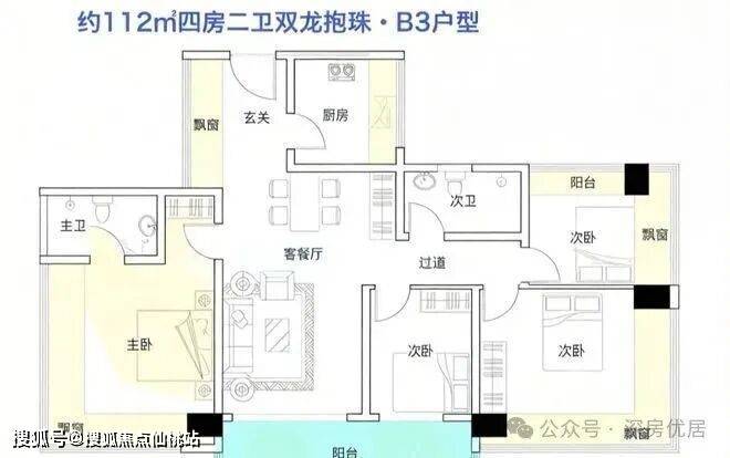 112㎡的4房2厅2卫(B3户型),设计的是竖厅双龙抱珠格局,进门独立入户玄关,餐客厅一体化设计,四开间朝南,全屋八面飘窗,主卧+1个次卧270°无柱转角飘窗,U型厨房,卫生间干湿分离,得房率约100%(包含赠送),客厅连接次卧出大阳台西南朝向。