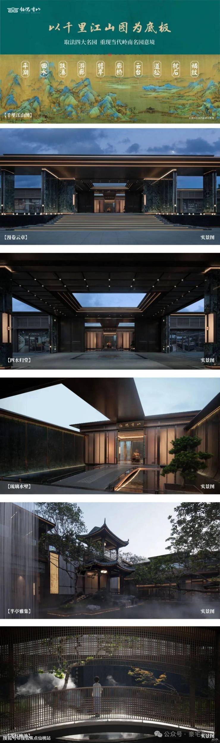 园林设计以《千里江山图》为灵感蓝本,巧妙融合岭南四大名园精髓,复刻佛山梁园"半边亭"。通过"漫卷云章"、"金水澜庭"、"琉璃水院"三进式景观轴线,呈现移步换景的东方美学。