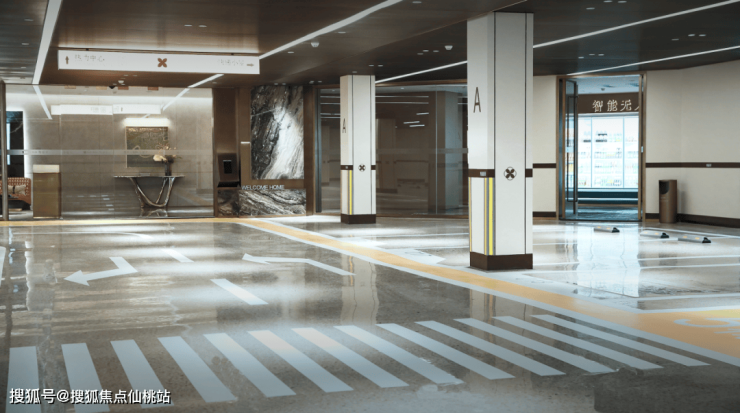 地库内使用历经超30次研磨的彩石深磨地坪,进一步降低噪音;从地库搭乘电梯的过程中,借鉴酒店大堂的TOP级标准,配置中央车马厅、星级落客服务,打造融合休憩、会客功能的自在场域,让归家充满礼序感和尊崇感;更设置万物仓、快递小屋、生鲜柜等配套,方便业主生活;车库100%预留充电桩,智享无接触式开门体验等内外兼修的细节。