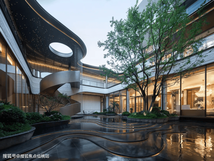 横向约67米、约7.5米高、如凤凰展翅的安缦风艺术门庭,异形处理的香槟色铝板屋檐、大面积大理石立面、黑金沙石龙鳞水波铺砖、高悬的明月园灯,拉满顶尖学府的归家排面。它不仅是建筑的起点,更将建筑、社区入口与地下车库入口完美地融合为一个整体。
