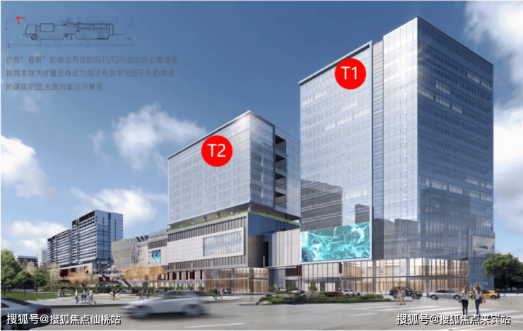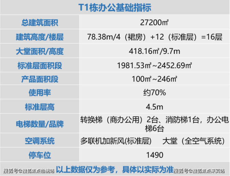 T1栋办公建筑面积约27200㎡,楼高约78米(限高100米),其中5-16层为办公,低区为商业,标准层建面约2400㎡,层高4.5米
