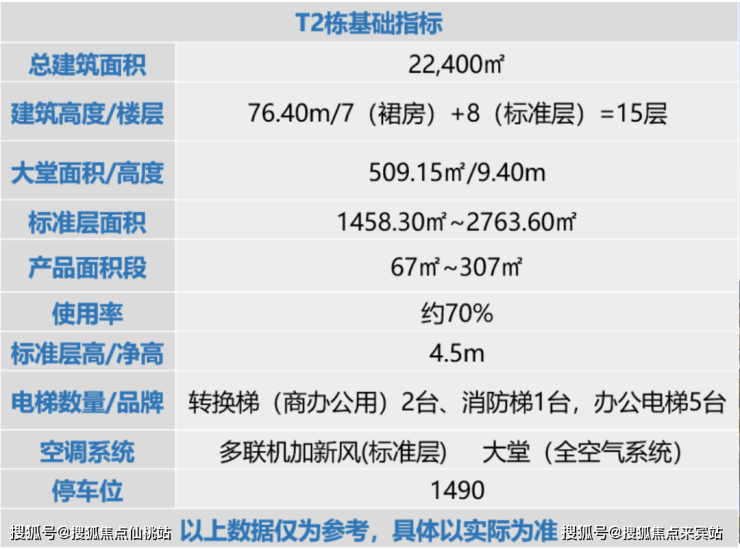 T2栋办公建筑面积约22400㎡,楼高约76米(限高100米),8-15层为办公,低区为商业,标准层建面约2500㎡,层高4.5米。