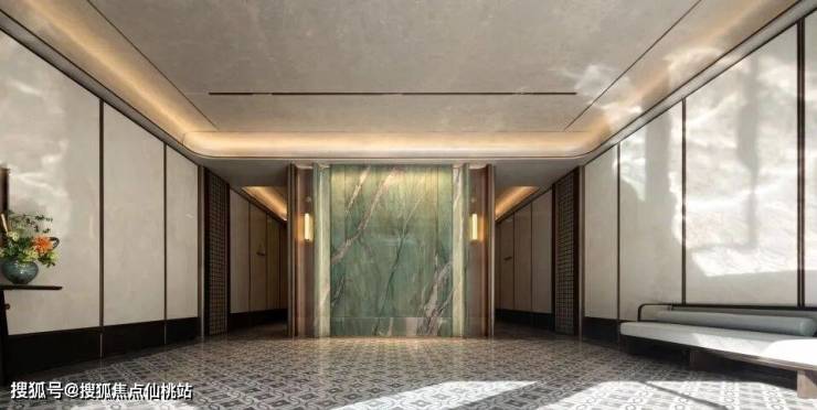 “山水剪影”艺术墙贯穿门厅与走廊,石材拼贴出宋画《溪山行旅图》的抽象变体,光影投射下,行人如游画中。电梯厅悬挂“天蓝釉刻花鹅颈瓶”复刻雕塑,裂纹釉面在射灯下泛出粼粼微光,仿佛将北宋官窑的千年气韵凝于一瞬。门厅在晨光中显得格外清晰,漫步于此,仿佛穿越千年的山水画卷。