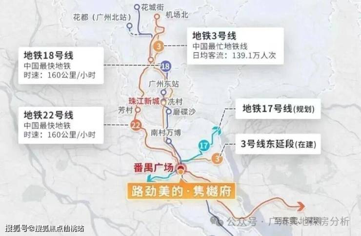 项目距离地铁站3号线番禺广场站约800-900米,在这里有4条地铁交汇,分别为18-22-3号线,还有规划中的17号线,去珠江新城、琶洲都是直达。自驾的话,项目周边有番禺大道,南沙港快速等线路,交通还是蛮便利的。