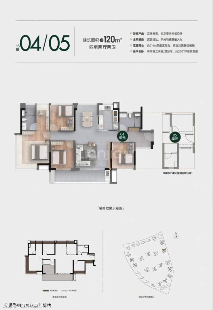 建面约 120㎡ 四房两厅两卫:核心改善户型,7 米南向宽景阳台,可灵活改造 4 灵动空间,适配三代同堂 / 多孩家庭