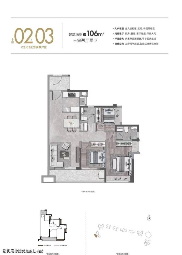 建面约 106㎡ 三房两厅两卫:刚改主力户型,动静分区无过道浪费,刚需首选;