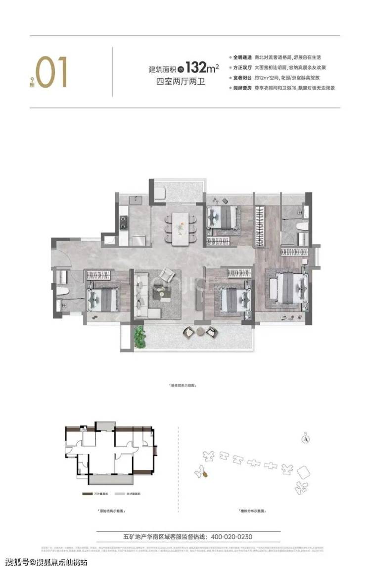 建面约 132㎡ 四房两厅三卫:头排江景户型,双南向主卧套房设计,8.2 米天幕宽景阳台,直面桂畔海无遮挡江景