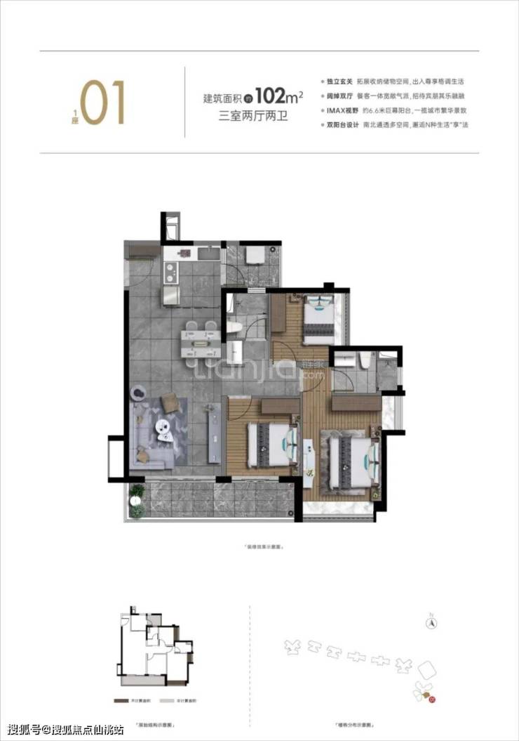 建面约 102㎡ 三房两厅两卫:入门级刚需户型,三开间朝南,6.2 米双开间南向景观阳台,主卧带独立衣帽间,适配年轻刚需三口之家;