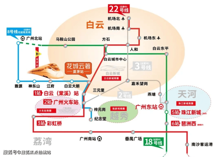 22号线北延段,广州南北大动脉,时速达160公里,贯穿空港、白云棠溪、广州火车站、南站等7大枢纽,全线换乘高达16处之多,无缝接轨广州全市。