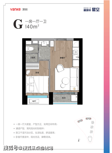 约40㎡产品:一房一厅大居室,户型方正,厨卫干湿污洁分区,卧室尺度舒适,生活私密,实用空间布局;