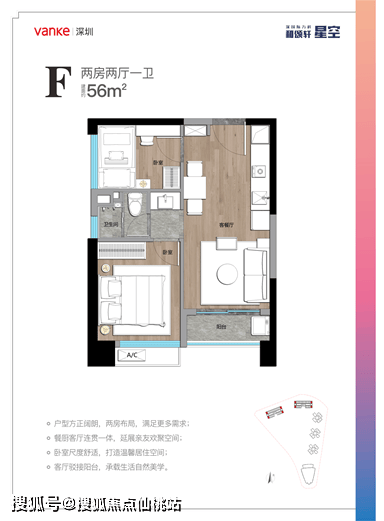约56㎡产品:两房布局,全明空间,户型方正实用,餐厨客厅连贯一体,客厅接驳阳台;