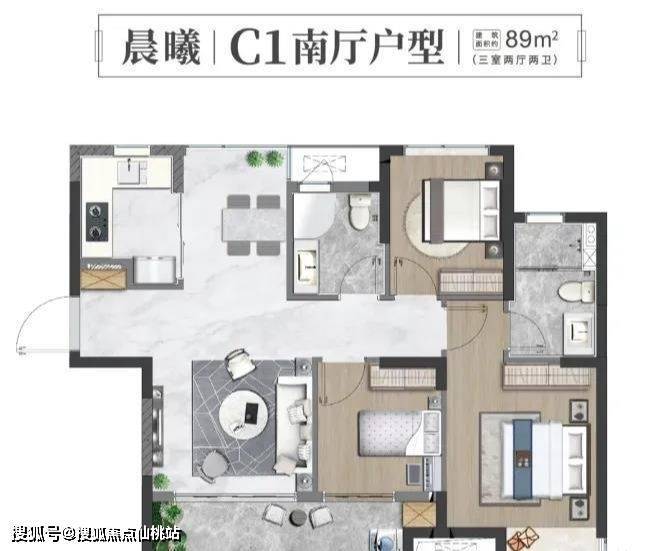 - 【晨曦3房89㎡南厅】 三房两厅两卫