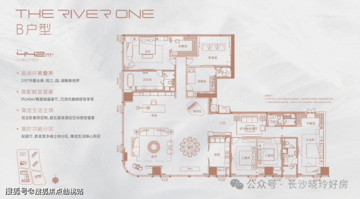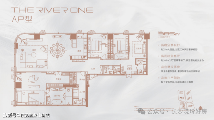人均百平化起步:打造建面约321-1200㎡江景峯值大平层,超越墅级生活侈度。