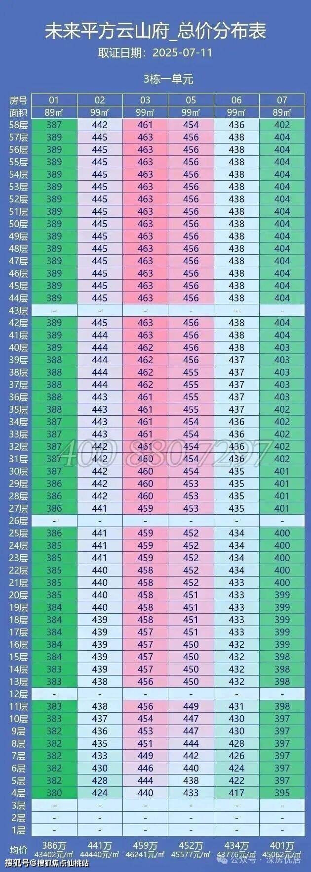 下面是上次加推的3栋1单元的备案价格表