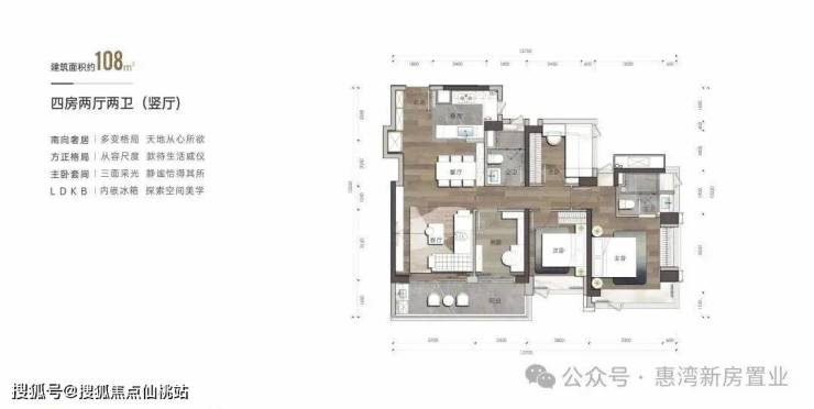 建筑面积约108㎡户型-4房2卫(竖厅)