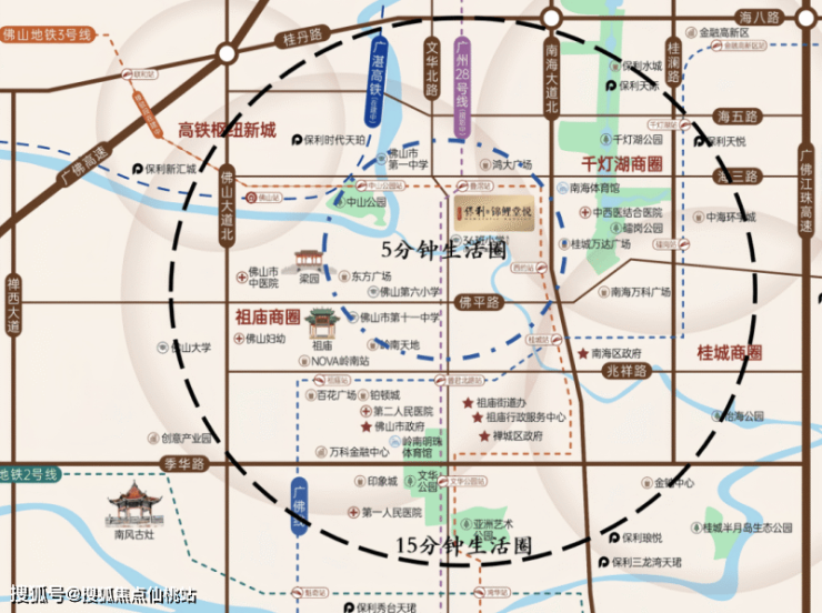 保利锦鲤堂悦落子于禅城祖庙板块,恰处于禅桂交界的黄金节点,可同时享受祖庙与千灯湖双城芯的资源辐射。项目直线距离千灯湖约1.5公里,周边3公里范围内覆盖12大商业综合体,包括南海万达广场、岭南天地等成熟商圈。