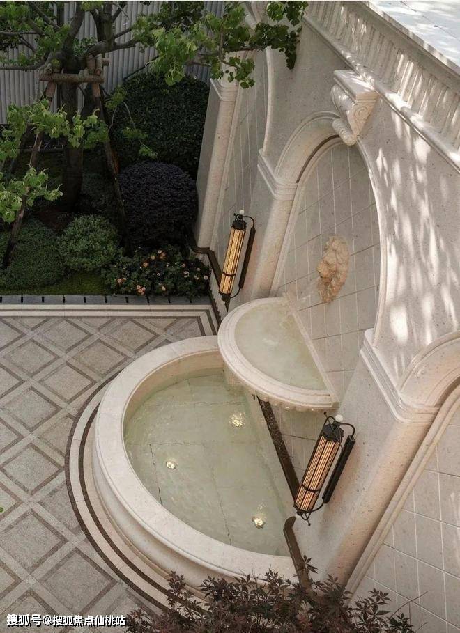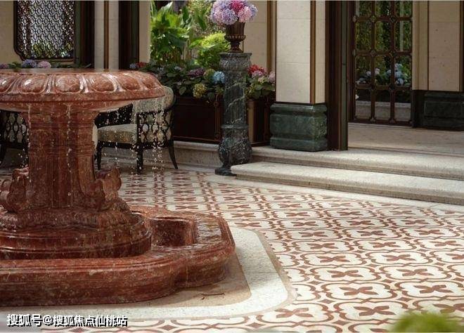 庭院设计从鼓浪屿百年建筑「容谷别墅」中汲取灵感,对莲花水钵元素进行复刻,并选用更显质感的红色调奢石作为材质,地面海棠纹铺砖采用高级海棠纹石材水刀拼花工艺。