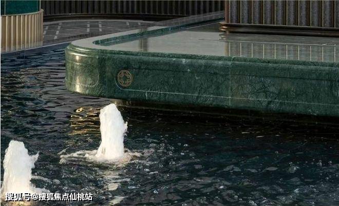设计以传世的红色奢石莲花水钵与海棠纹水刀拼花石材经典重现,灵感来自于鼓浪屿的百年建筑「容谷别墅」,可见其背后高技派的毫米级当代建造工艺。