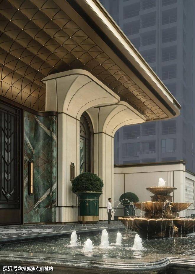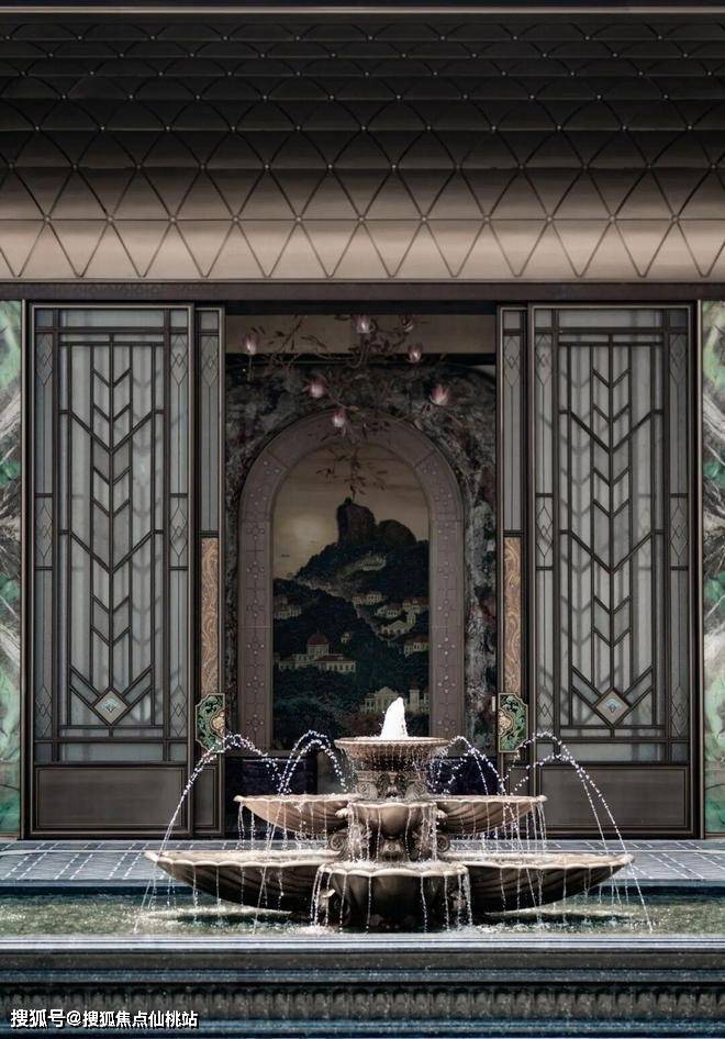 水景中央的“玉印棠前”水钵,灵感取自吴越文化博物馆的海棠杯器型,结合东方吉祥意象与西方对称秩序,以叠级盛放的形式隐喻花开富贵、礼序归心。亦是串联门厅与庭院之间空间语境的重要节点,让人行至此处,自然转入内向宁静的节奏。