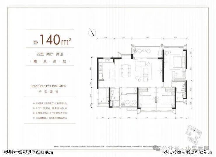 另外还有140㎡的四房户型,采用横厅设计,南北对流,北向主阳台望公园,南向卧室飘窗看小区园林,只是目前剩余房源已经不多,价格也相对更高一些。