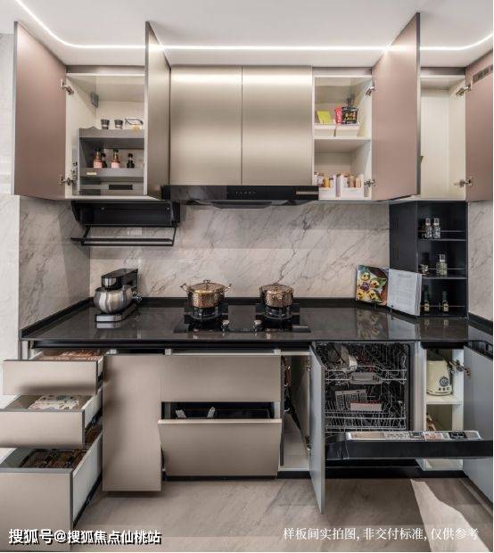 建发海宸打造了超容量橱柜,以更丰富的立体收纳空间,让空间化繁为简、化整为零,配齐吊柜拉篮、双侧台面调料柜、餐具与厨具收纳等,确保做菜时随手能拿到想要的调料,真正做到藏纳有道,拿放有序。