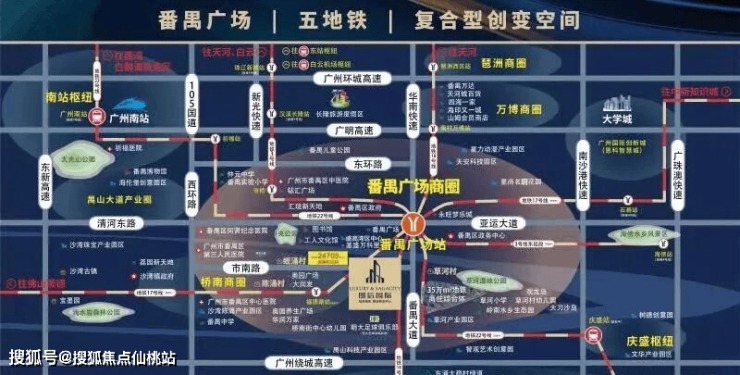番禺广场站场站综合体是广州新一轮地铁线网的场站综合体的重要示范点,是五线交汇的重要交通枢纽,包括:已经建成的地铁3号线,未来还将增加地铁3号线东延线,18号线、22号线、17号线。
