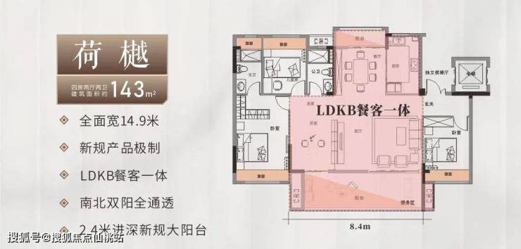 以洋房128㎡户型为例,全户型面宽近 14米,客厅阳台 7.4 米,完全可以对标市场上150㎡大平层尺度。客阳区域采用无梁柱设计、LDK 客餐厨阳一体贯通,南北双阳台、通透性拉满。实际使用率超 100%。私密性也更强,独立私家电梯厅、双开门电梯,互不干扰,保障了居民的隐私。