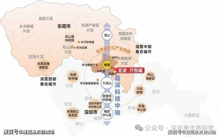 宏发·万悦城择址塘厦核心区,鲤鱼塘水库旁,以万亩湖园为圆心,集“产、学、研、融、商、居”六位于一体。 项目地处临深新一代电子信息产业基地范围内,是东莞市首宗通过单一主体挂牌招商并完成要约收购工作的产城融合连片改造项目,总占地面积约796.8亩,创下东莞单一主体挂牌招商成功交易项目面积之最。近年来,塘厦立足“东南门户、产业重镇”的全新定位,凭借两面临深的地理优势,提速建设“临深新一代信息产业基地”。随着华为的重磅落地,未来塘厦将坐拥以华为牵头形成的万亿级产群利好,再现“松山湖”奇迹。