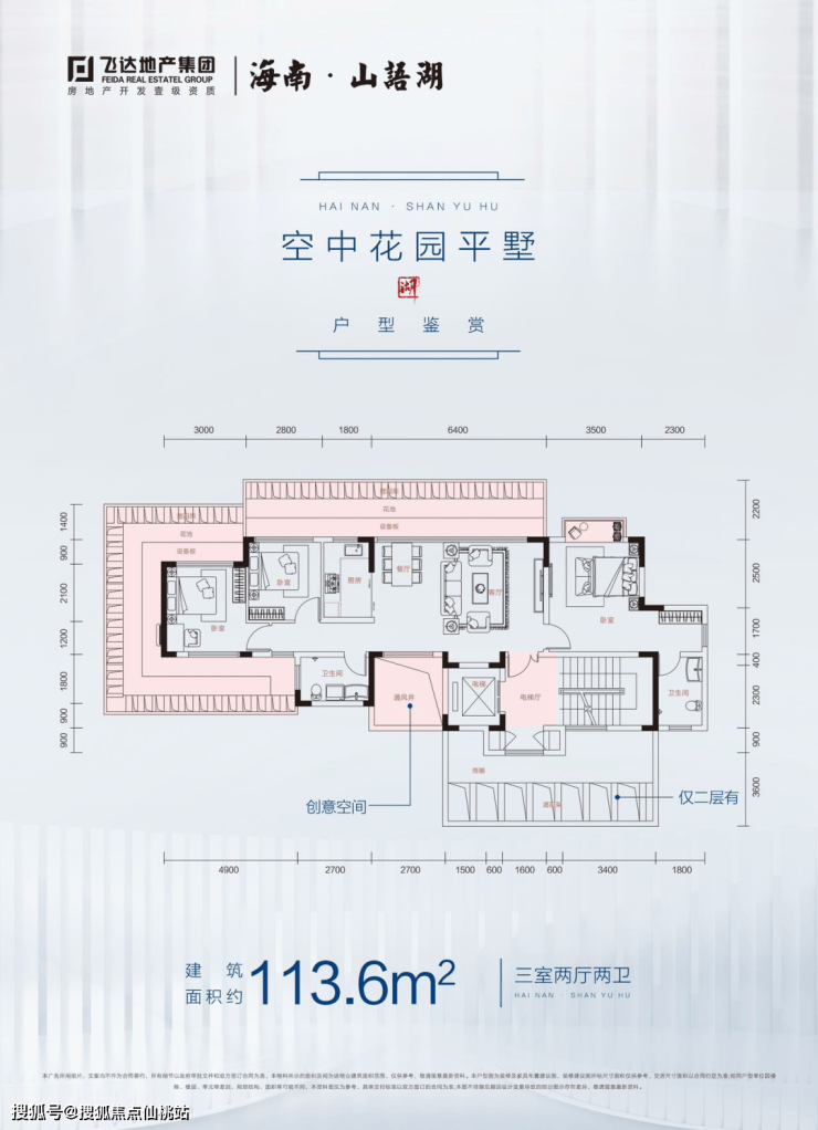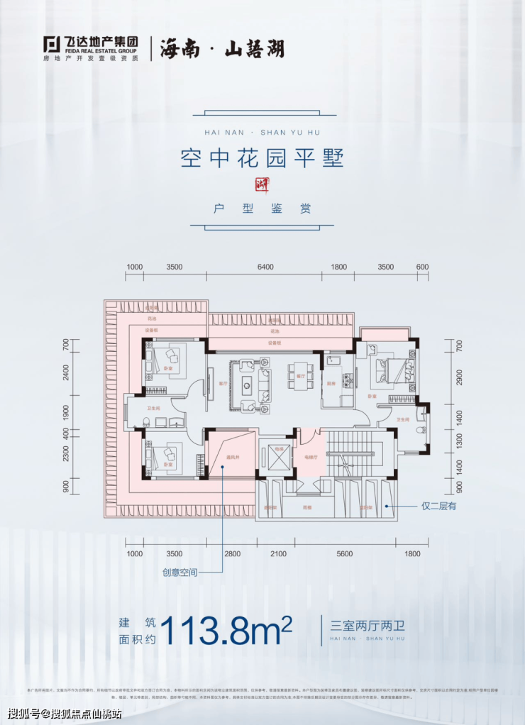 【空中花园平墅】实得面积约 166 - 187㎡,建面约 111 - 113㎡五室两厅两卫。6.4 米客厅开间,赠送约 50 平三面阳台。独特的设计,让您拥有属于自己的空中花园,尽享浪漫与惬意。
