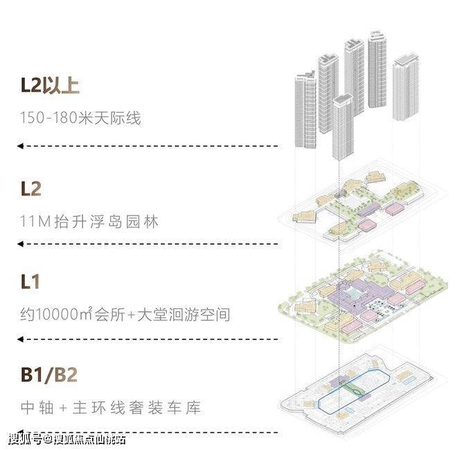 其中,B1和B2是业主的归家环线,包括星空顶的奢装车库以及中轴,通过酒店式环岛落客,给足排面。