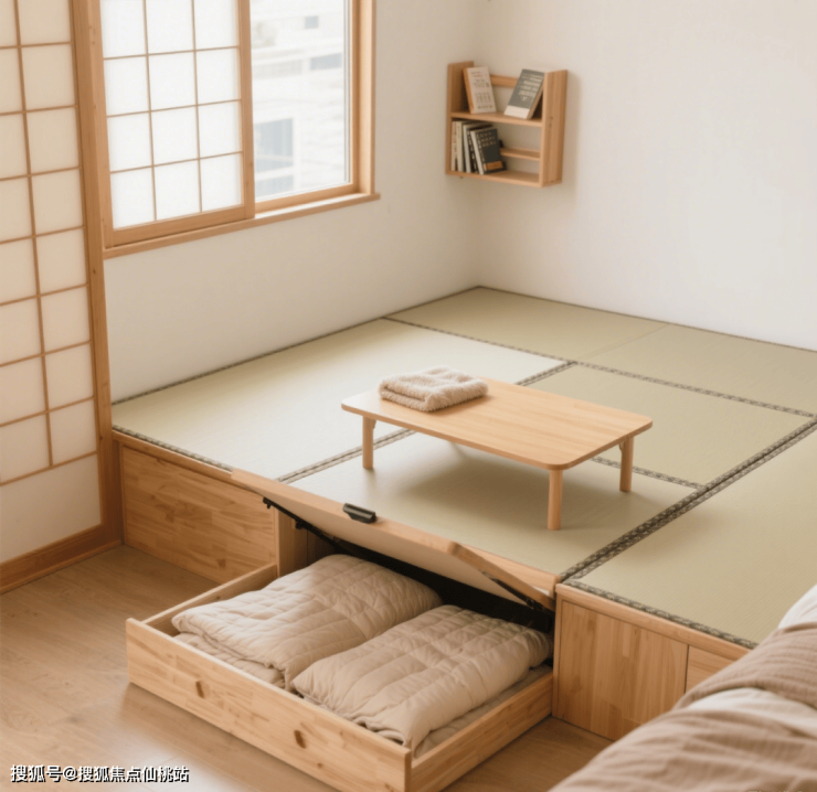 ⑦次卧:采用 “榻榻米 + 升降桌” 组合,榻榻米下方分区域做抽屉和翻盖收纳,升降桌升起是书桌,孩子写作业、大人临时办公都能用,降下后铺上软垫,秒变榻榻米床,朋友留宿也不愁。