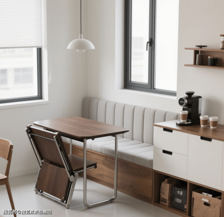 餐厅区域定制 “卡座 + 折叠餐桌”,卡座下方是大容量收纳柜,放杂物、囤货超方便;折叠餐桌平时收起来是 80cm 宽的小吧台,满足 2 - 3 人用餐,来客时展开成 1.5 米长餐桌,轻松容纳 6 人就餐。