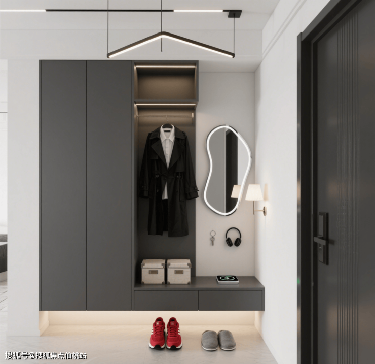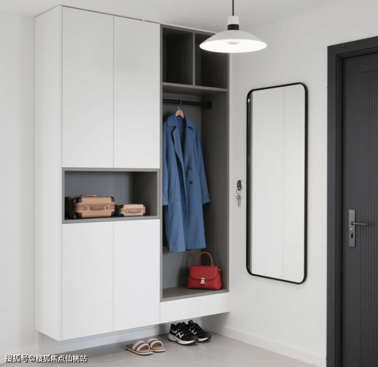 ④玄关:利用入户右侧墙面,定制 “顶天立地 + 悬浮” 玄关柜。柜体底部悬空 30cm ;中间留空 15cm ,放小物件;上方柜体深度 35cm ,挂放长外套、收纳行李箱,还在柜体侧面安装穿衣镜,出门前整理穿搭超方便。