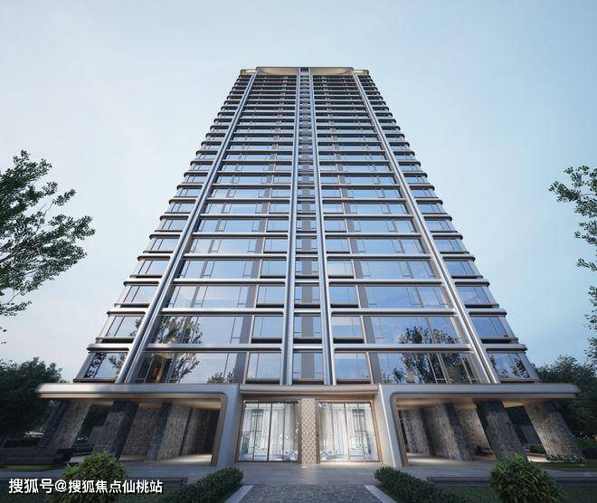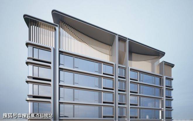 外立面擢取海洋生活美学配色,采用香槟金铝板线条+海浪灰金属涂料,搭配落地玻璃窗,局部配置隔声效果良好的三玻两腔夹胶中空玻璃,降低了周边的噪声影响。
