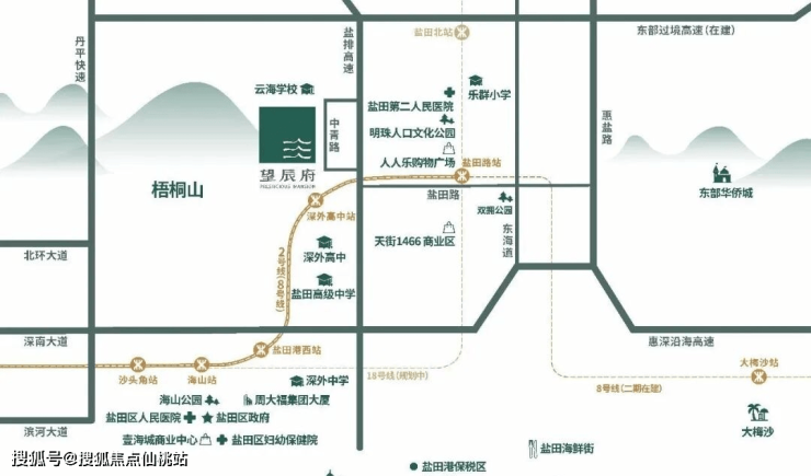 望辰府位于盐田港片区,中青路半山溪谷花园西侧,梧桐山半山腰上。这个位置,属于盐田港全新开发的区域,附近楼盘基本都是2015年后新建的,城市界面相当新。