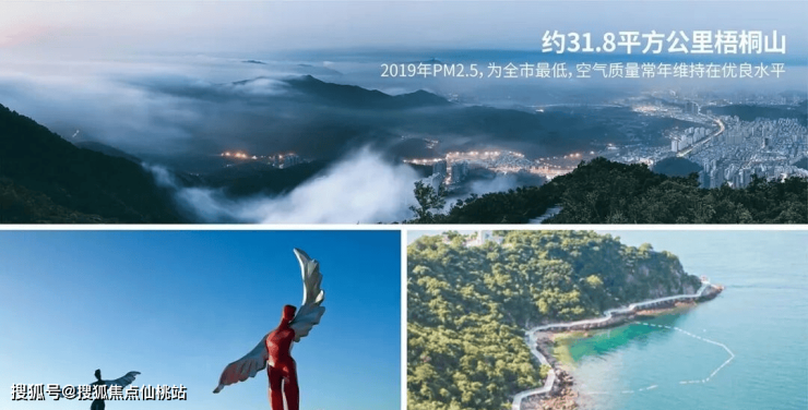 这是项目最大的亮点之一。梧桐山就在家门口,31.8平方公里,森林覆盖率88%,负氧离子全市最高,PM2.5全市最低。项目与梧桐山接壤,向西可以俯瞰深圳市区,向南与香港大雾山对峙,东南方向能看大鹏湾海面和大鹏半岛。