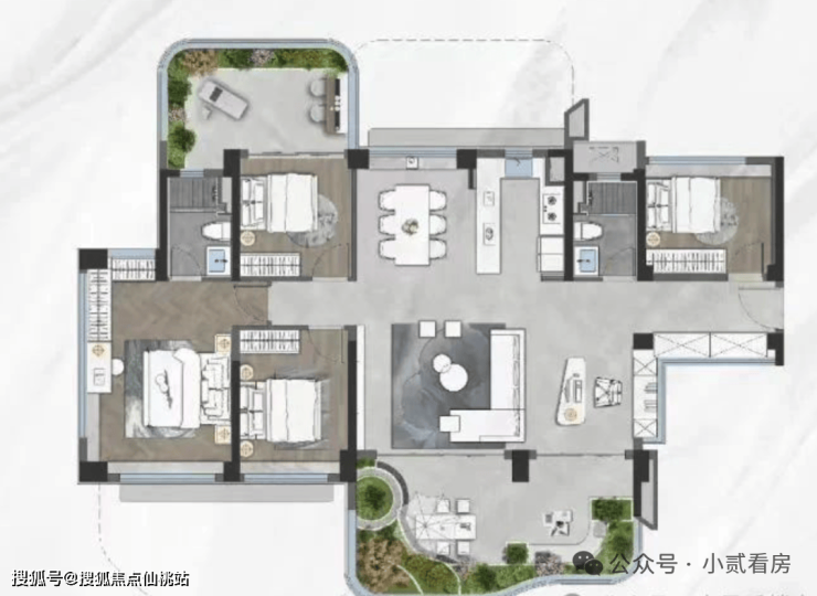 4+1房设计,南向4开间,约10.45米景观阳台,连通两个次卧,串联LDKG,空间尺度不言而喻。