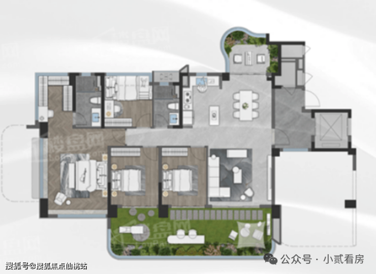该户型把赠送面积都给了工区和主卧,全屋做到4+1房,空中花园连通公区,面积达到73㎡。最牛的是,主卧还带约14㎡的空中花园,打造一个私享庭院。