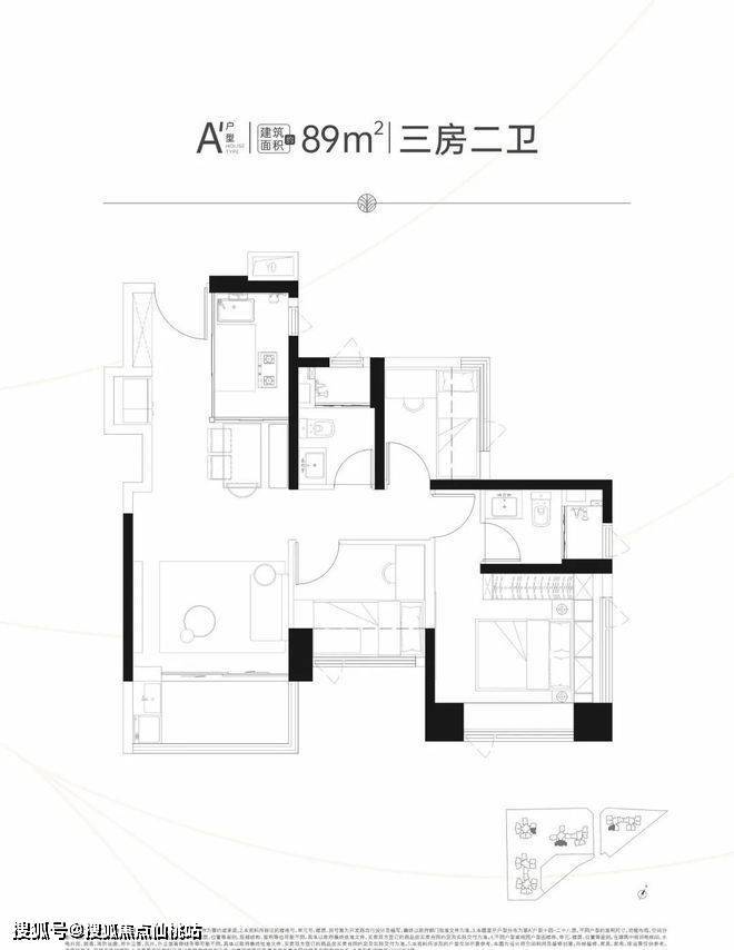 89平米三房两卫户型,阳台为东北朝向,卧室客厅是东北-西南通透,价格在227-243万左右,