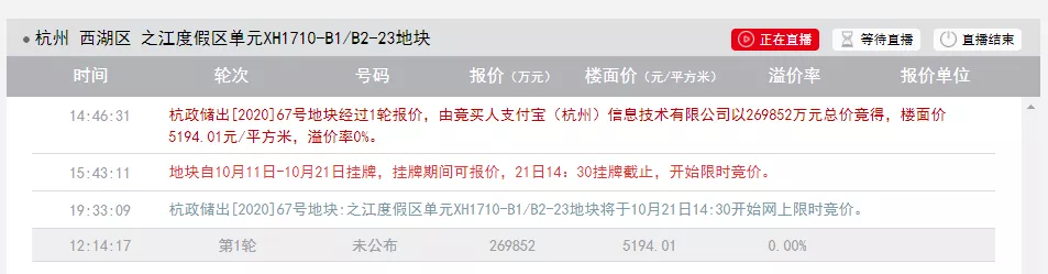 【蚂蚁金服旁】刚刚!杭政储出[2020]67号地块——之江度假区单元XH1710-B1/B2-23地块以总价265892万元,成交楼面地价5194.01元/㎡的底价成功出让给蚂蚁集团。